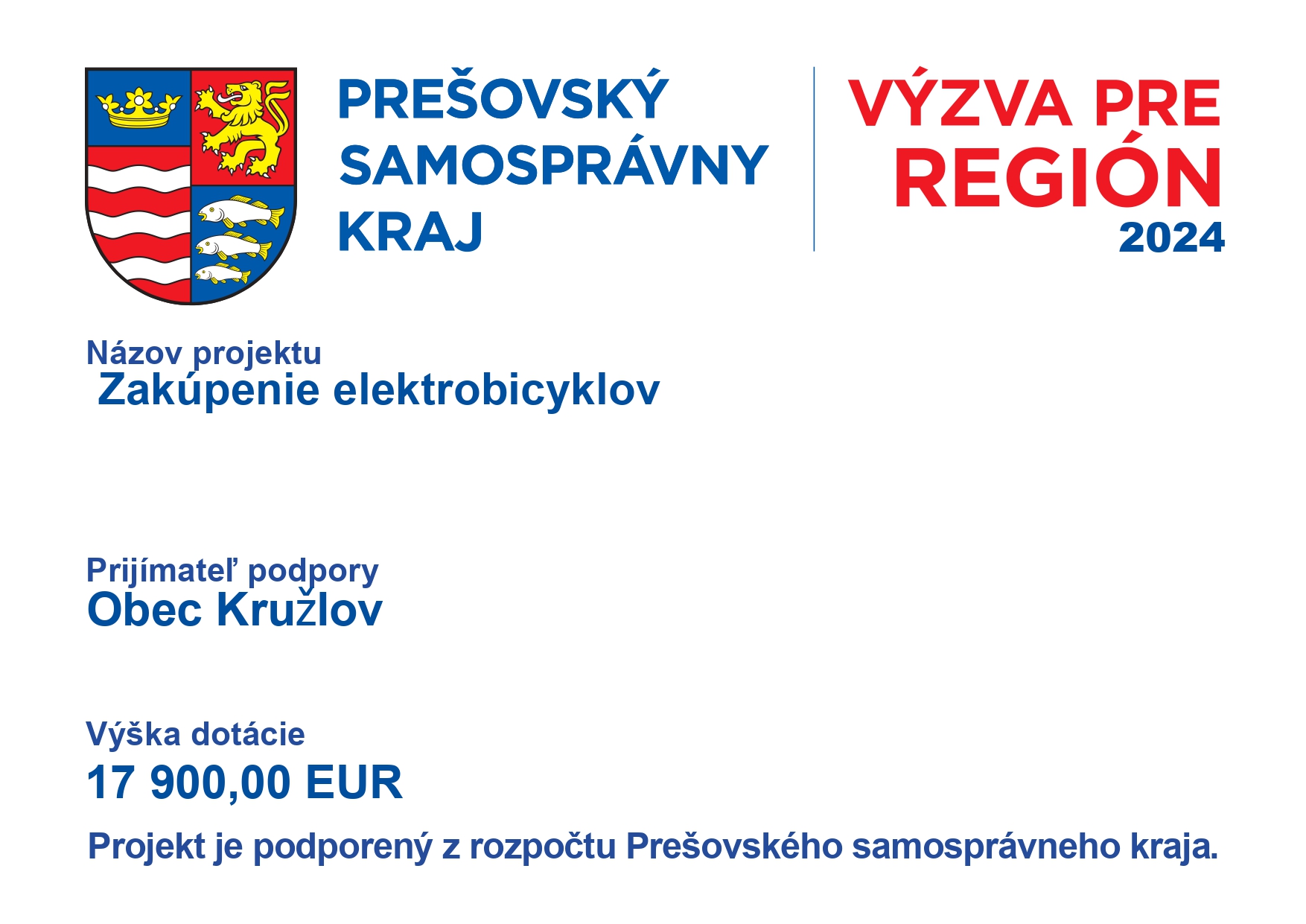 Obec Kružlov vrámci podpory rozvoja cestovného ruchu zakúpila 9 ks elektrobicyklov. Zakúpenie elektrobicyklov bude bezplatne slúžiť pre účastníkov poznávacích podujatí regiónu Horná Topľa, bude mať výrazný pozitívny prínos pre rozvoj cestovného ruchu.