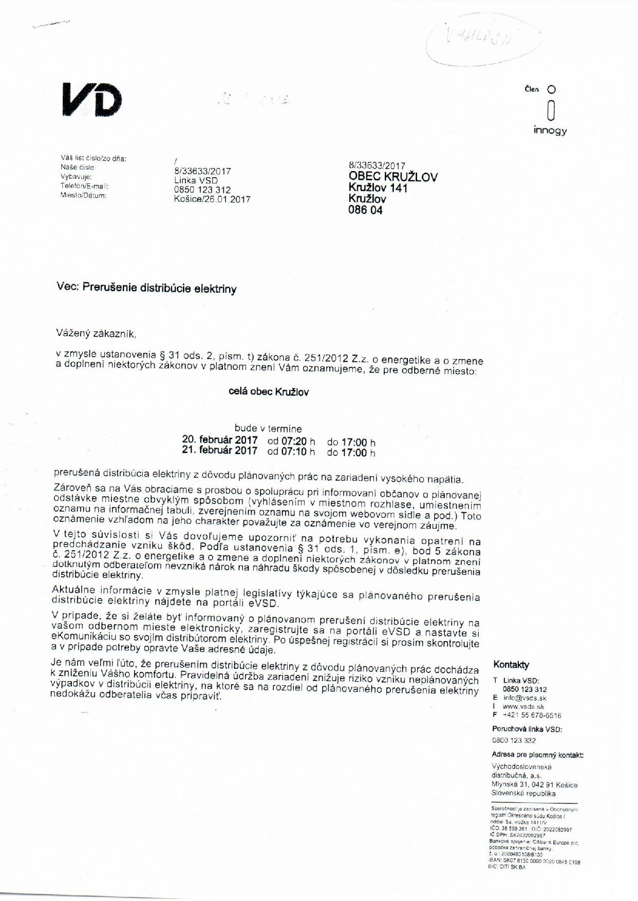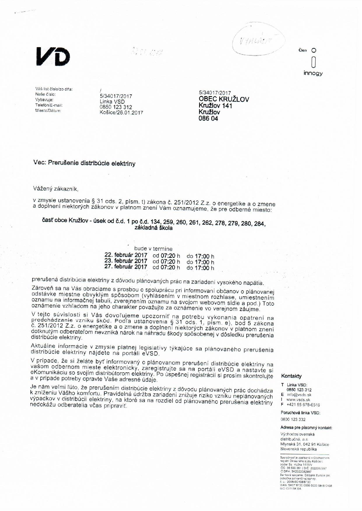 Východoslovenská distribučná, a. s. oznamuje, že plánovaná odstávka elektrickej energie v dňoch 20.02.2017, 21.02.2017,22.02.2017, 23.02.2017 a 27.02.2017 sa ruší, preto elektrická energia bude v celej obci.
